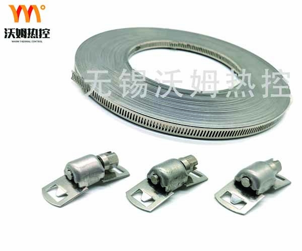 由10mm寬1.0mm厚連續(xù)長(zhǎng)度的不銹鋼扎帶以及固定螺絲所組成。它可以將接線盒等附件固定在管道上。鋼帶可根據(jù)管徑大小,按實(shí)際需要長(zhǎng)度剪切。安裝時(shí),調(diào)節(jié)時(shí),調(diào)節(jié)固定螺絲,即能將接線盒或其它附件固定在管道上。