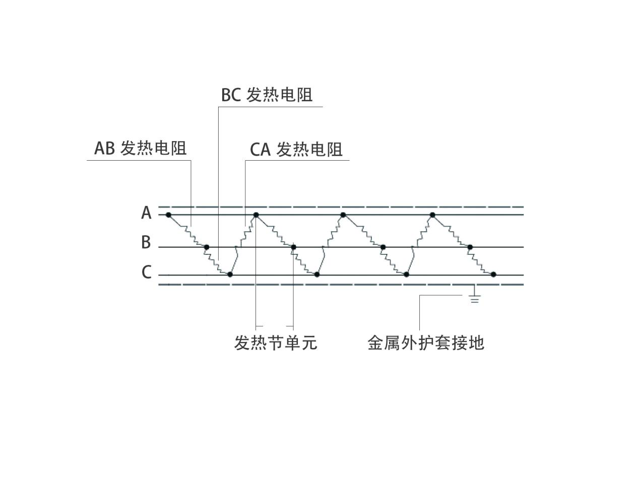 三根相互平行包覆在絕緣層中的鍍錫銅絞線,作為電源母線,并在其外表加覆一層絕緣層作為內(nèi)護(hù)套層,在其表面纏繞電阻絲,電阻絲每隔一定的距離(發(fā)熱節(jié))與母線連接,形成連續(xù)并聯(lián)電阻,母線通電后,各并聯(lián)電阻發(fā)熱,因而形成一條連續(xù)發(fā)熱的電伴熱帶。可任意剪切;金屬編制層(需接地)在提高抗拉強(qiáng)度的同時(shí)也避免了靜電的產(chǎn)生。